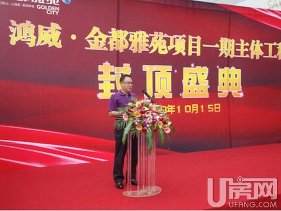 在封顶仪式致辞中,惠州市鸿威房地产开发有限公司彭 树平总经理表示:金都雅苑项目一期主体工程按期顺利封顶,是各参建与合作单位通力配合、辛勤努力,及政府相关部门和社会各界朋友大力支持和关心的结果。金 都雅苑项目一期主体工程按期顺利封顶,为整个项目保质按期完工奠定了良好的基础,下一阶段将进入建筑装修、水电安装和室外工程全面施工阶段。他希望项目能 争创惠州市优质样板工程,努力把金都雅苑建设成为惠州大江北片区的地标性建筑,从而为客户打造一个环境优美、品质优良的理想家园。